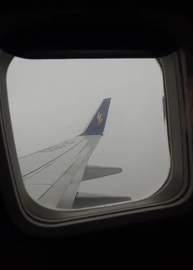 n airplane wing seen through a window. The wing is white and has a blue tail with a colorful logo on it. The sky is gray and overcast. The video is taken from inside the airplane.