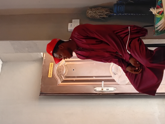 The image portrays a single male individual seated indoors within a building identified as an "ASSON SECRETARIAT" in Minna, Nigeria