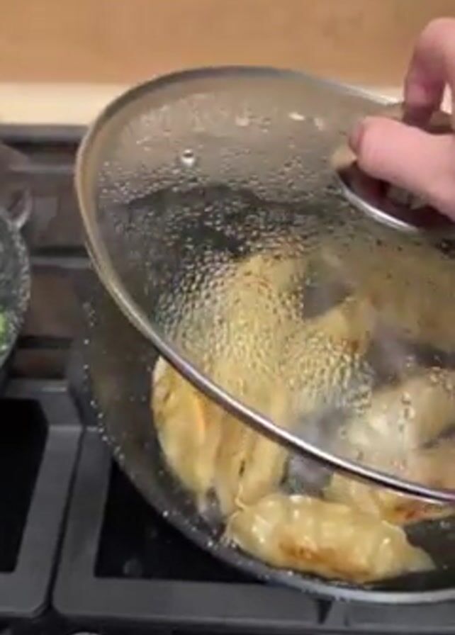 close-up view of a frying pan on a stovetop. The pan contains several dumplings that are being cooked in oil. Steam rises from the pan as a hand lifts the glass lid to reveal the dumplings. The dumplings are golden brown on one side, suggesting they have been fried for a while. The stovetop is black with white markings, and there is another pan visible to the left, though its contents are out of focus. The kitchen's countertop appears to be a light wood grain.