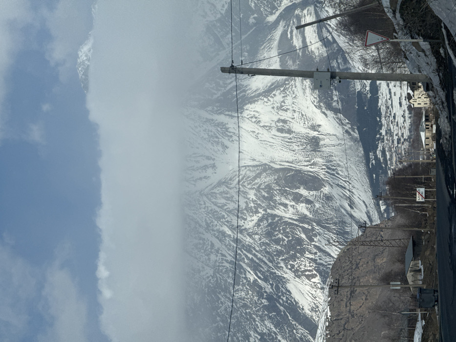 The image presents an outdoor, wide-angle view of a mountainous landscape featuring the town of Sioni, Georgia. The upper portion of the frame shows a blue sky with a prominent, horizontal band of light grey clouds that partially obscure the distant mountain peaks. One snow-capped mountain peak is visible above the cloud line on the upper right. Dominating the background are vast, rugged mountains extensively covered in snow, with exposed dark rock formations creating a textured surface. In the midground, nestled within a valley, is the settlement of Sioni, Georgia, characterized by numerous buildings with light-colored roofs, interspersed with sparse, bare-branched trees. Patches of snow are visible on the ground throughout the town. The foreground features a dark asphalt road that curves from the left towards the center-right. Alongside the road, on the left, is a steep, rocky, brownish-grey embankment. Multiple utility poles and lines traverse the scene. A tall, light-colored wooden utility pole stands on the right side of the road, featuring an attached grey electrical box and overhead power lines that extend horizontally across the image. Another wooden utility pole is visible further back on the left, near the rocky slope, alongside a metal lattice power pylon. On the left side of the road, a small structure with a dark roof and lighter walls is visible next to a dark green/grey wheeled dumpster. A white sign with a red horizontal stripe and a blue sign displaying white Georgian script are positioned further down the road on the left. On the right side of the road, a red and white triangular yield sign is partially obscured by snow and a utility pole. Two residential buildings are visible on the right, one appearing to be under construction with an incomplete roof, and the other a multi-story building with a light-colored facade. Snow patches are present on the ground adjacent to the road and structures. No individuals, animals, or active vehicles are discernibly present within the image. The scene conveys a cold, winter or early-spring environment.