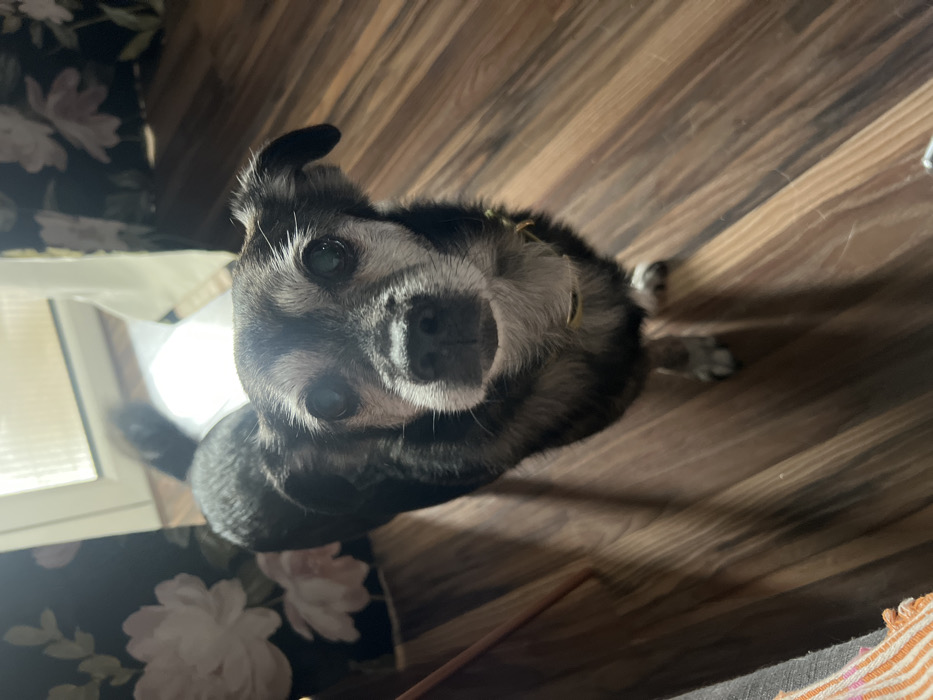 A small, elderly dog with black and gray fur gazes upward with its dark eyes. The dog has a small, curled tail and a slightly bent ear. It stands on a wooden floor, casting a shadow. Floral-patterned fabric is visible on the left side of the image, along with a window in the background. A light object is behind the dog. There is an orange and white striped fabric in the lower right corner.