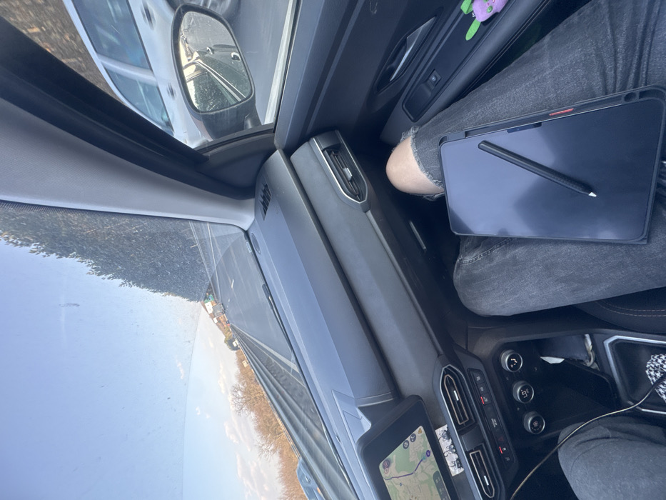 The image depicts the interior of a moving passenger vehicle on a multi-lane highway identified as being in the city of Baliovtsi, Bulgaria, under a clear daytime sky. The perspective is from the passenger side, looking forward and to the right. In the foreground, the legs of a person, likely a passenger, are visible. This individual wears dark, distressed denim jeans, with a torn section on the right knee exposing skin. A dark-colored tablet with a black stylus resting on its screen is positioned horizontally on their lap. Partially visible on the far left, another person's leg, clad in grey pants, suggests the presence of a driver. The vehicle's dark grey dashboard features a central infotainment screen displaying a navigation map with a route. Below this screen are air vents and rotary climate control knobs. A dark door panel is visible on the right, containing a small purple and green plush item in a storage pocket. The right side mirror reflects a segment of the highway and a silver vehicle in an adjacent lane. Externally, the asphalt highway has white lane markings. A dense row of tall evergreen trees lines the right side of the road, while a metal guardrail and bare deciduous trees are visible on the left. Other vehicles are present on the highway in the distance. The windshield exhibits some smudges or dirt.