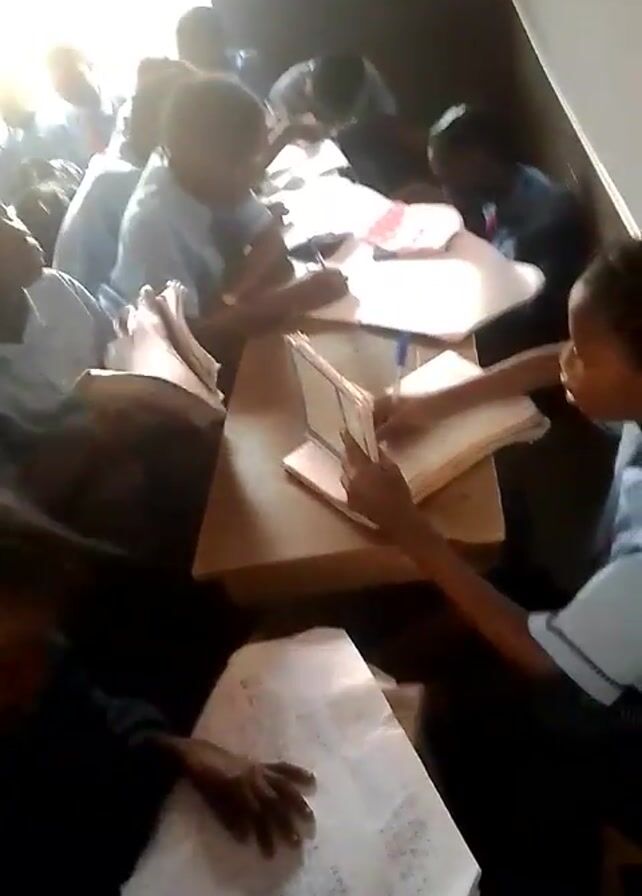 classroom filled with students wearing what appears to be school uniforms. Most are seated at desks, with papers and notebooks in front of them, and are engaged in writing. There is bright sunlight streaming into the room, obscuring some details. One student in the foreground looks up at the camera and smiles.