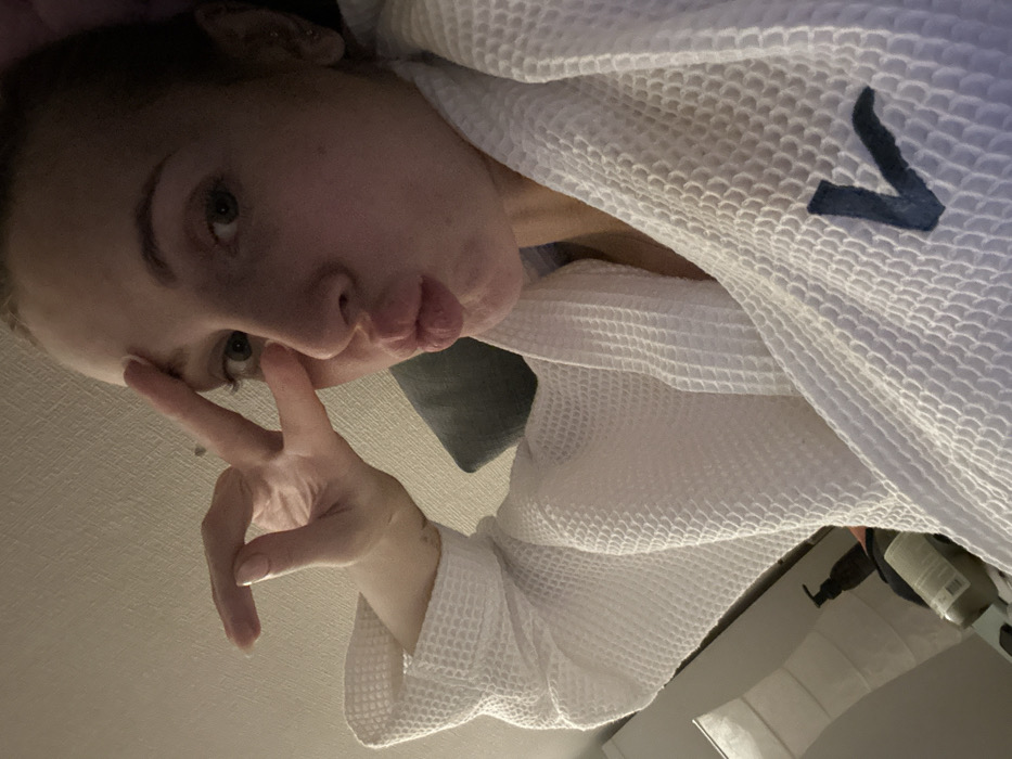 A woman in a white, waffle-patterned robe poses for a selfie. Her face is angled towards the camera, her lips puckered in a kiss. She makes a peace sign with her left hand. A grey cushion sits behind her head and part of a desk with objects on it is visible in the lower right corner. A dark blue "V" is on the robe. The photo appears to have been taken indoors with moderate lighting.