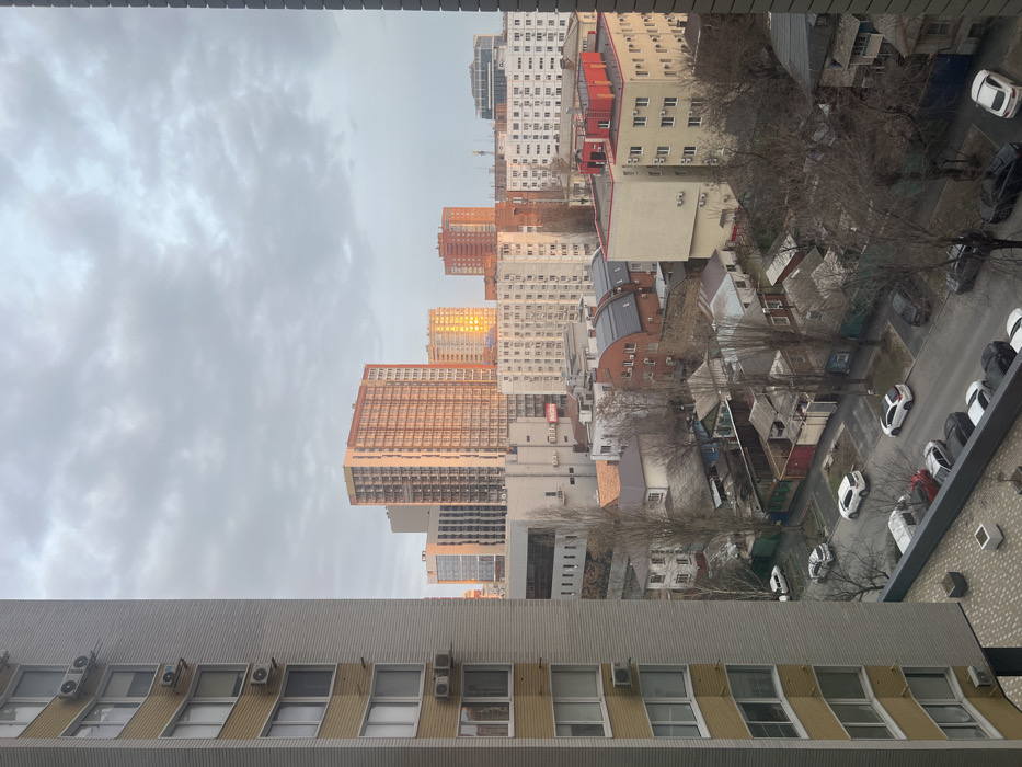 The image displays an elevated urban landscape in Rostov-on-Don, Russia, under an overcast sky with direct sunlight reflecting on specific structures. In the immediate left foreground, a section of a tall building's facade is visible, characterized by light-colored horizontal siding, multiple windows, and numerous external air conditioning units mounted below each window. A gray paved area with two square planters is present at the bottom left. The midground features a street with approximately twelve parked passenger vehicles, including white, red, and dark-colored cars. This street is flanked by a dense arrangement of varied low-rise residential buildings, exhibiting different architectural styles, materials (brick, stucco), and rooflines, including several with dark, curved roofs, some potentially fitted with solar panels. Bare deciduous trees are interspersed among the buildings. No individuals are visible. The background is composed of a dense cluster of multi-story buildings. Several high-rise structures with orange-brown facades are prominent; one appears to be under construction with visible structural elements. A building in the mid-right background intensely reflects bright yellow sunlight, suggesting a low sun angle from an unseen source. Other background structures include older, lighter-colored apartment blocks and commercial buildings. The sky is predominantly gray and cloudy, with a brighter section indicating the sun's general position.