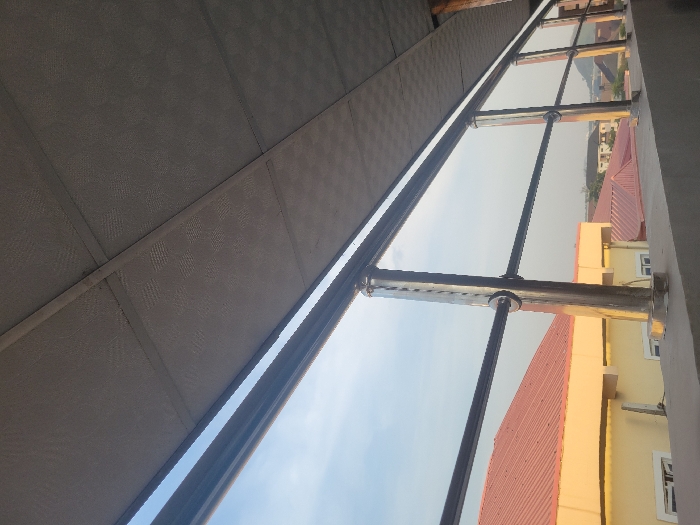 The image captures an exterior view from an elevated position, likely a balcony or covered walkway, located in the city of Unknown, Unknown