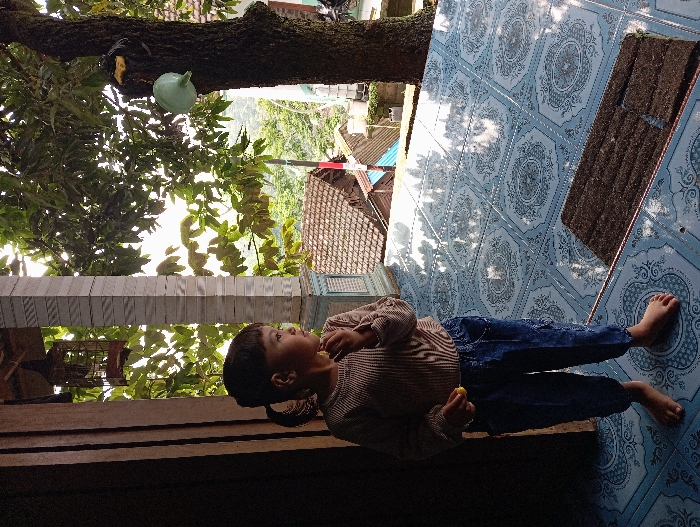 - "An outdoor scene captured in Bulukandang, Indonesia, shows a young child standing barefoot on a patterned blue tiled porch, partially illuminated by sunlight" by FM-TnUEx2, licensed under CC BY 4.0