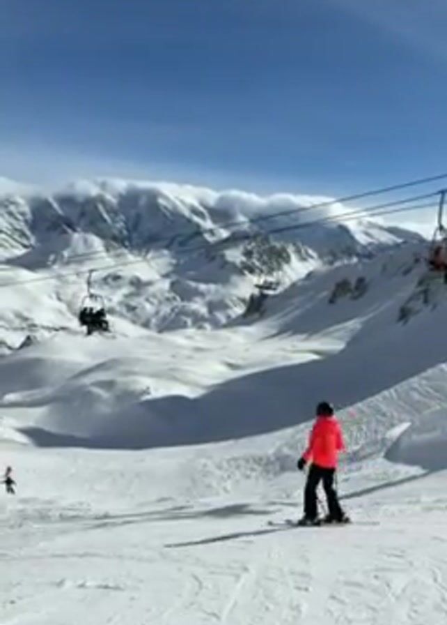 winter landscape with snowy mountains under a blue and partly cloudy sky. Several skiers are seen coming down a slope. A ski lift with people on it is visible above them. The slope is well-groomed with tracks in the snow. The overall scene suggests a ski resort on a sunny day.