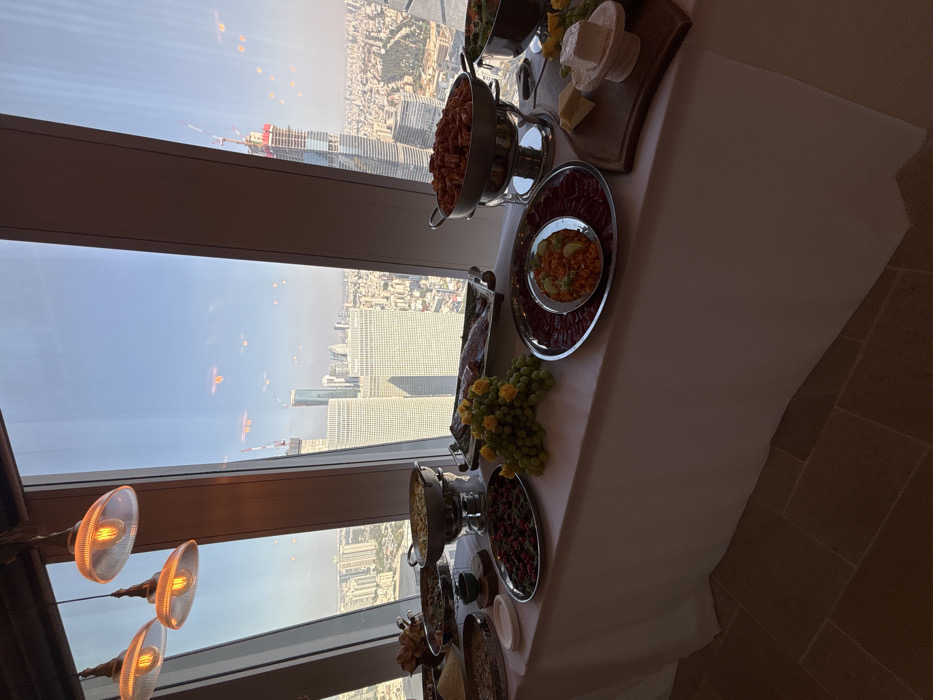 The image displays an interior scene from a high-rise venue, likely a restaurant or event space, within the Azrieli Sarona Tower in Tel Aviv, Israel