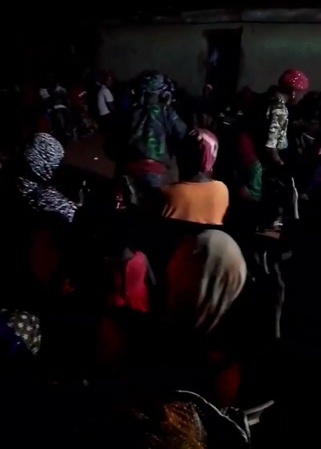 dark and unclear scene of a gathering of people, possibly in a community hall or a similar large indoor space. Many people are wearing head coverings or turbans. Some individuals are seen dancing or moving actively in the center of the gathering, while others sit and watch. The low lighting and the distance from the camera make it difficult to distinguish specific features or details. The general impression is a communal event or celebration with music, dancing, and socializing.