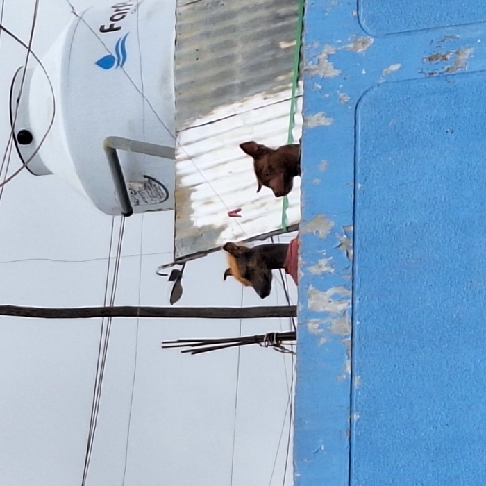Two brown dogs peek out from under a makeshift tin roof. The roof is adjacent to a large, white water tank with the brand name "Forza" printed on its side. A clothesline hangs below the roof with a red clothespin. A blue, peeling wall forms the right edge of the frame, and a bundle of sticks is visible below the lower dog. Electrical wires crisscross the background, contrasting with the white sky.
