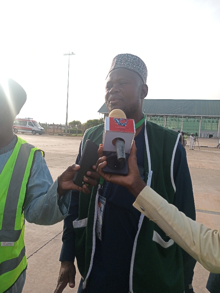 The scene is a paved area at the Nnamdi Azikiwe International Airport, Abuja (latitude: 9.0608, longitude: 7.4879). A man wearing a green vest, white shirt, and a traditional cap is being interviewed by a reporter holding a microphone. Another individual is holding a cell phone in the background. The man in the green vest is speaking into the microphone. There is a building with a green roof in the background. There are people and vehicles in the distance. The sky is overcast. The time of day is afternoon. The sun is shining but there are clouds in the sky.