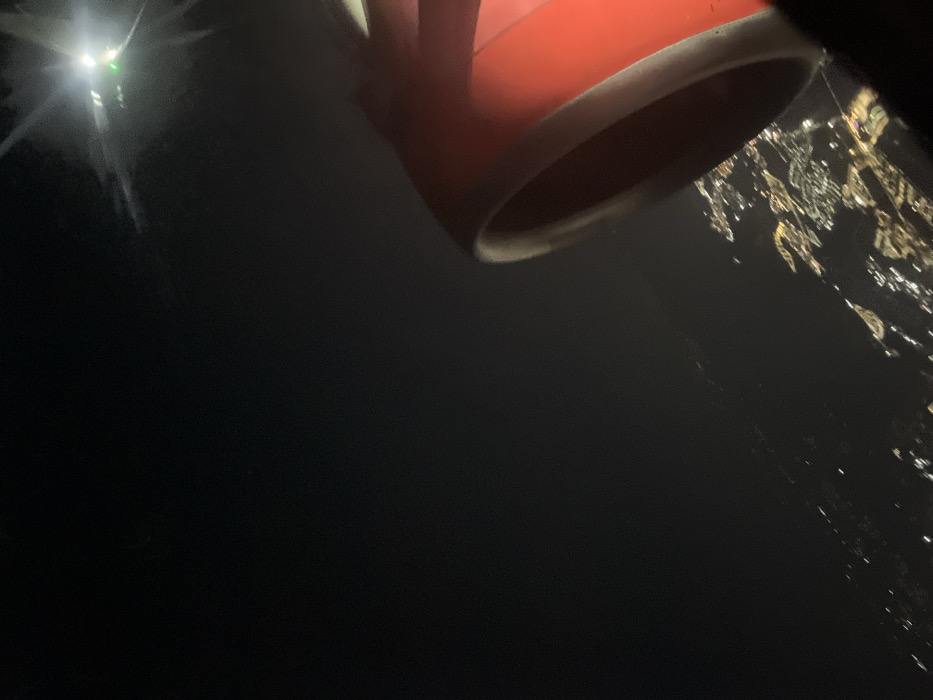 From a high vantage point, a city sprawls into the night, its lights scattered like gems on a dark cloth. A red and white object, possibly a mug or container, dominates the upper portion of the frame, its rounded edge creating a visual foreground. A distant tower emits a strong light, contrasting with the pervasive darkness. The scene evokes a sense of distance and perspective, contrasting the human element (the object) with the vastness of the urban landscape.