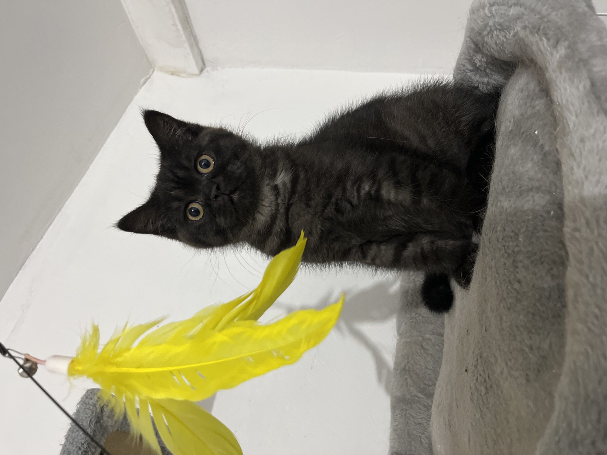 A dark gray tabby kitten with yellowish-green eyes is peering down at a yellow feather toy from a gray cat tree. The background is a white wall with a visible corner. The location is not discernible in the provided image.
