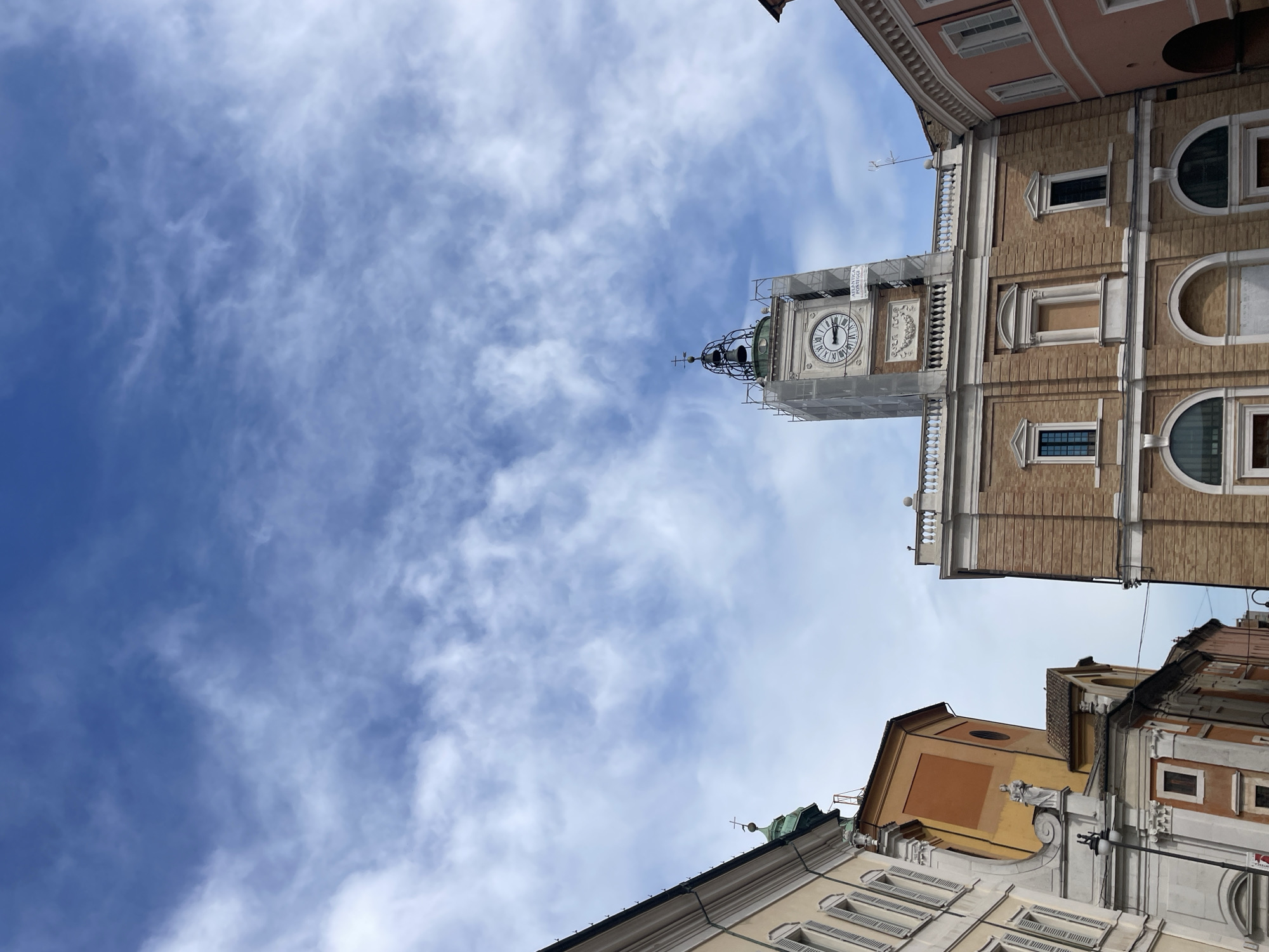 A worm's eye view of the Piazza del Popolo in Ravenna, Italy features a historic building with a clock tower under scaffolding