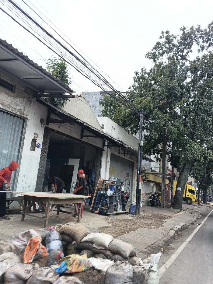 A street scene shows a low, dilapidated building with open garage doors where several men are working. Tools and supplies are scattered around the workspace. An uneven sidewalk runs along the front, partially obstructed by sandbags or bags of dirt. Utility poles with numerous overhead wires line the street, interspersed with trees. A motorcycle is parked nearby and a small yellow truck is visible down the street. The sky is overcast.