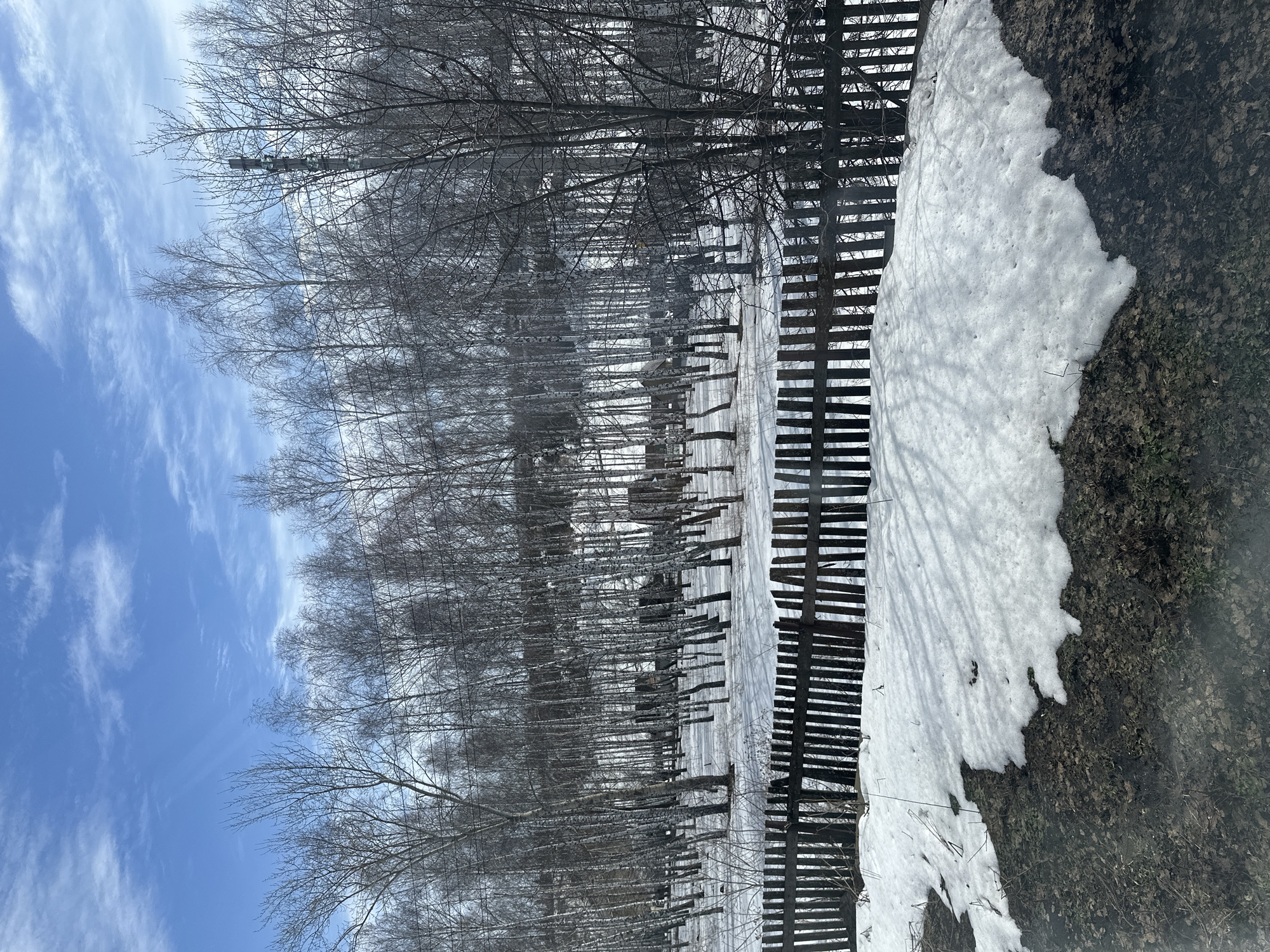 The image depicts a winter scene likely in Aktanysh, Russia. A row of thin, bare trees lines the left side of the frame, their branches reaching towards a blue sky with wispy clouds. Adjacent to the trees is a weathered wooden fence, partially obscured by snow. Patches of melting snow cover the ground near the fence and along the edge of a dark, earthy area. There are no people visible. The scene conveys a sense of late winter or early spring thaw.