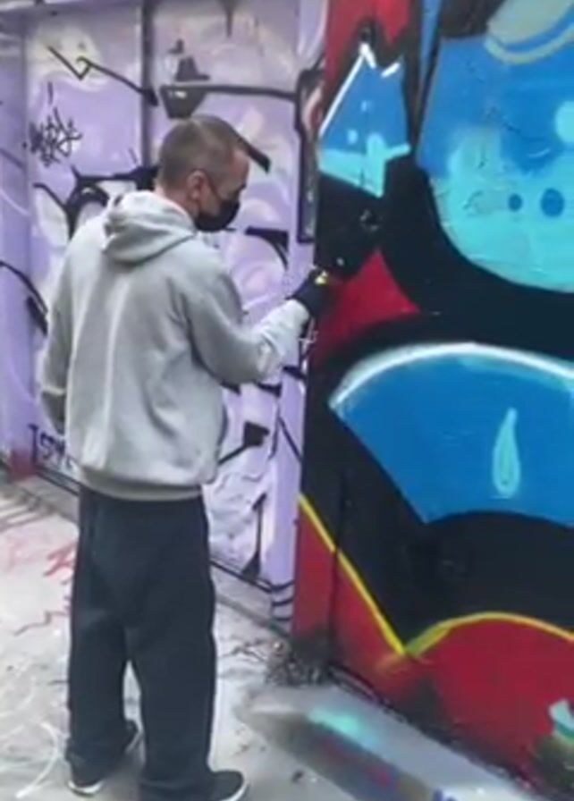 A man is applying black spray paint to an existing mural on a wall. The mural features colorful graffiti with shades of blue, red, and yellow. The man is wearing a grey hooded sweatshirt, dark pants, a black face mask, and black gloves. The wall to the left has purple graffiti. The ground appears to be concrete.