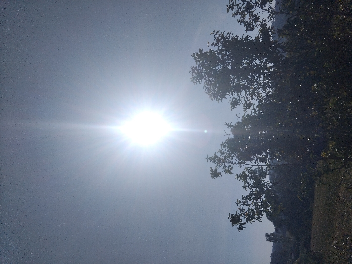 The sun shines brightly in a light blue sky