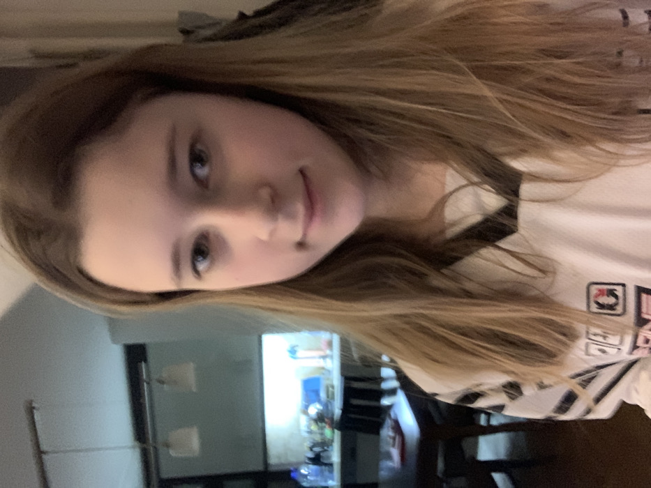A young girl with long, light brown hair looks directly at the camera. She is wearing a white shirt with a black collar and what appears to be a sports-related design on the sleeve. The background shows a dimly lit room with a dining table and chairs. An aquarium or display case can be seen in the background. The photo seems to be taken indoors in a casual setting.