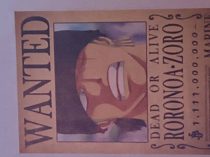 A rectangular tan-brown "WANTED" poster is depicted at a slight angle against a plain, light-colored vertical surface in an indoor location in Unknown, Unknown. The poster features the prominent capitalized word "WANTED" in dark serif font at its apex. Centrally, a framed animated character portrait shows a male subject from the chest up. This subject has light skin, visible green hair beneath a dark beanie, and a strained, open-mouthed expression revealing teeth. His left eye (viewer's left) is open and bloodshot, while his right eye is closed or obscured. Three gold-colored hoop earrings are visible on his right ear. Below the portrait, the text "DEAD OR ALIVE" is printed, followed by the name "RORONOA ZORO" in larger, decorative dark serif font. A bounty of "฿ 1,111,000,000-" is listed beneath the name, accompanied by small, illegible text and the partially visible word "MARINE" in the lower right section. The scene is evenly lit, indicating ambient light conditions.
