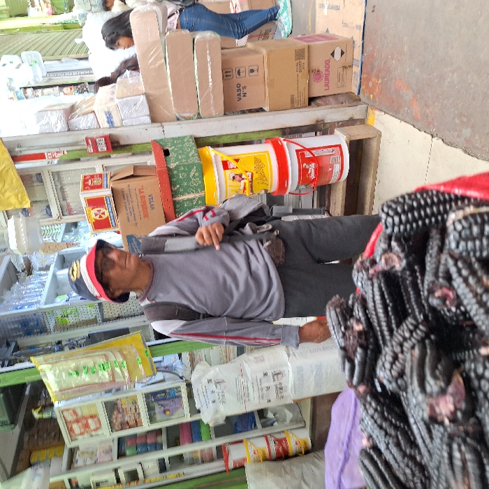 Inside a store, a man in a gray shirt and hat stands in front of shelves stocked with merchandise. Beside him are large bags. Behind him, red and yellow paint buckets rest on top of cardboard boxes. Above them, two people are leaning on the boxes, with one wearing blue jeans and the other partially obscured.
