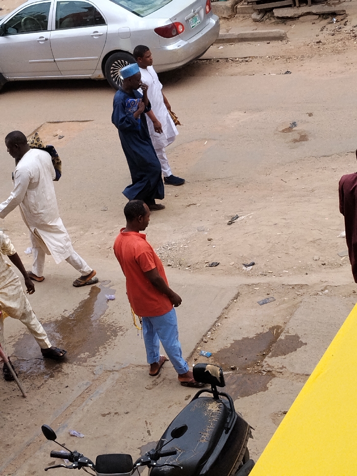 The image depicts a street scene in Fagge A, Nigeria, observed from an elevated perspective. The ground consists of a mixed dirt and concrete surface with uneven patches, small puddles of water, and scattered debris including plastic wrappers. A silver sedan, possibly a Toyota Corolla, is parked on the left side, partially on a raised curb. In the immediate foreground, the handlebars and a heavily worn black seat of a motorcycle or scooter are visible. Six adult males are present in the frame. On the far left, a man wearing light-colored traditional attire is partially visible, holding a walking stick. To his right, another man in a long, white, traditional tunic and dark sandals walks right-to-left, carrying a patterned bag over his left shoulder. Centered in the mid-ground, a man in a dark blue traditional robe and a light blue cap walks right-to-left, holding a small blue object near his face. Adjacent to him, another man in a white long traditional tunic and dark blue sneakers walks in the same direction, holding a light-colored bag in his right hand. In the foreground, a man wearing an orange short-sleeved t-shirt, light blue trousers rolled at the ankles, and brown sandals stands facing away and slightly left, with a yellow string-like object hanging from his left hip. On the far right, only the lower torso and legs of a sixth man, wearing a dark reddish-brown garment, are visible. The men are either walking or standing on the street surface.