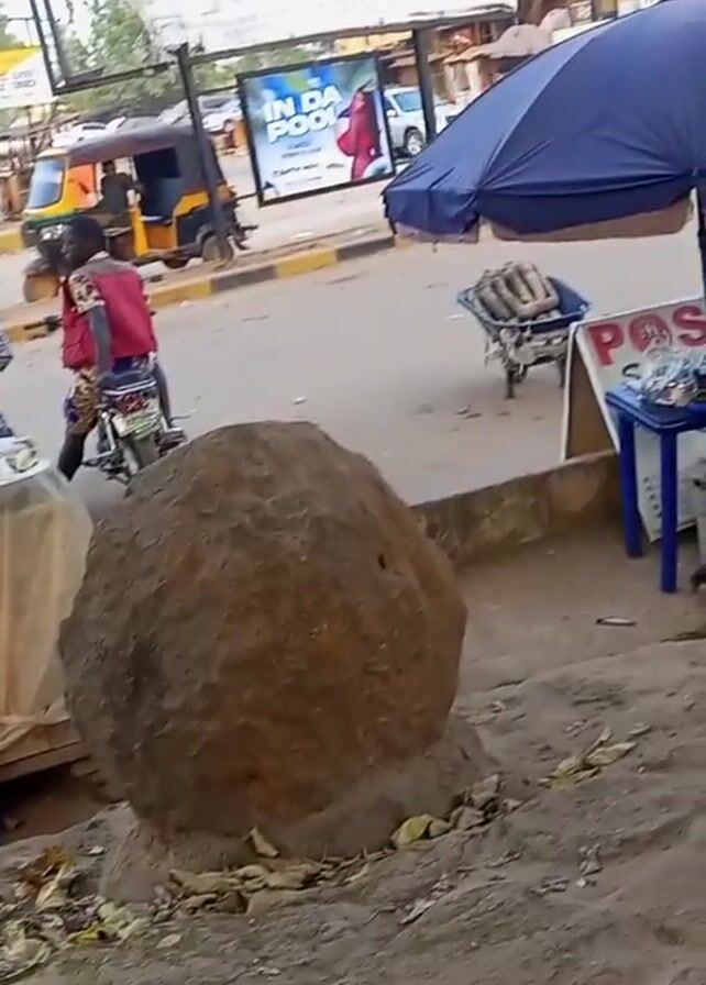 The video depicts a street scene during daylight. The foreground features a large, irregularly shaped rock resting on a dirt embankment. To the right of the rock, a woman is sitting on a blue plastic chair at a small blue table underneath a large blue umbrella. She appears to be interacting with objects on the table. A POS sign is visible next to the table. Behind the woman, a wheelbarrow filled with long objects, possibly planks or logs, is partially visible. The street is in the middle ground of the scene. A motorcycle with two people is shown riding on the street. A yellow auto rickshaw is parked further down the street. Billboards and street signs are visible in the background. A spare tire is on the ground to the right of the rock in the foreground.