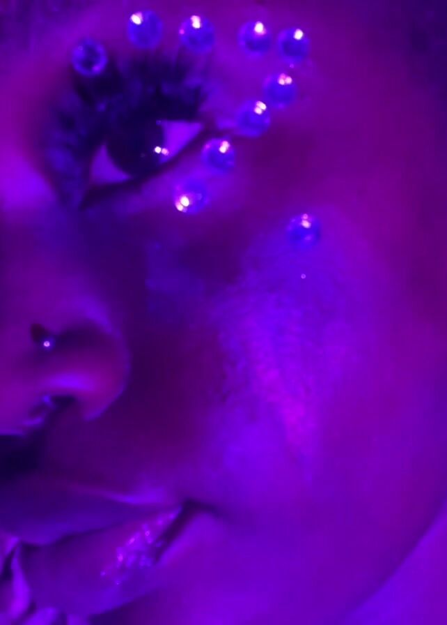 A close-up shot shows a person with dark skin and light-colored braids illuminated by a deep purple light. They have a nose piercing and are wearing makeup that includes eye shadow, false eyelashes, and rhinestones around one eye. They are looking directly at the camera with a neutral expression. The background is dark.