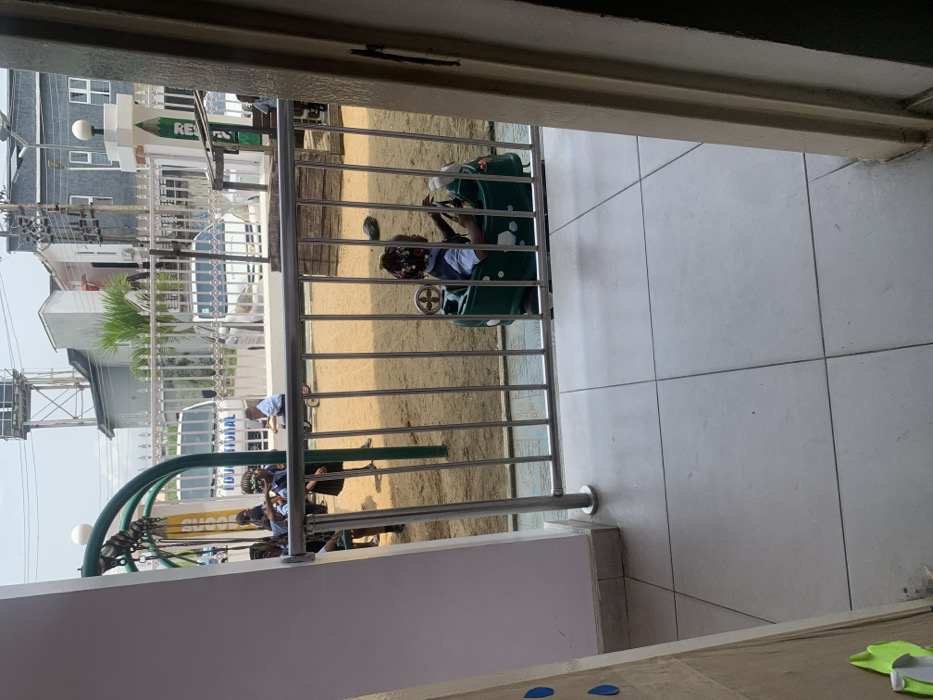 The image depicts an outdoor playground in Lekki, Nigeria, viewed from an interior doorway. The foreground shows light-colored tiled flooring and a silver-colored metal railing with vertical bars, separating the indoor space from the outdoor area. The railing is anchored to a light grey wall on the left. The outdoor playground features light brown sand or dirt ground. In the midground, a young child with dark braided hair and colorful beads, wearing a light shirt and dark vest, is seated in a dark green, car-shaped ride-on toy, facing right. To the left, several other children, dressed in similar school uniforms (dark skirts/trousers, light shirts), are visible near a green swing set structure. One child appears to be interacting with the swing. A low wooden border or structure is present in the center of the playground. Beyond the playground, a tall metal fence with horizontal and vertical bars separates the area from a street. On the street, a white van with partial text "NATIONAL" visible (likely "INTERNATIONAL") is parked, along with another white vehicle. In the background, several multi-story buildings, including white and grey structures, line the street. A tall, skeletal metal structure, possibly a water tower, is visible on the left. A decorative white pillar with a green vertical element, possibly part of a gate, is on the right, displaying partially visible text. The sky appears hazy or overcast.