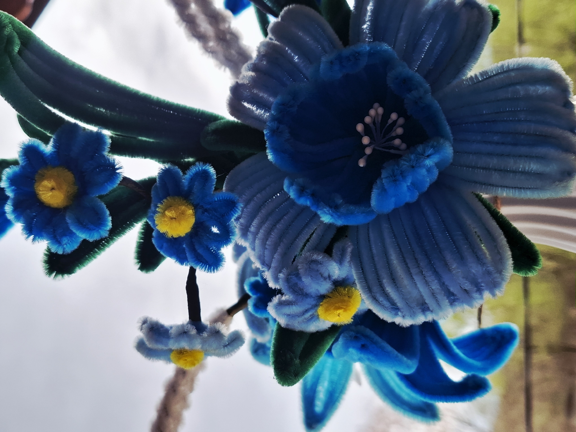The image presents a close-up, upward-angled view of an artificial flower arrangement crafted primarily from blue and green pipe cleaners