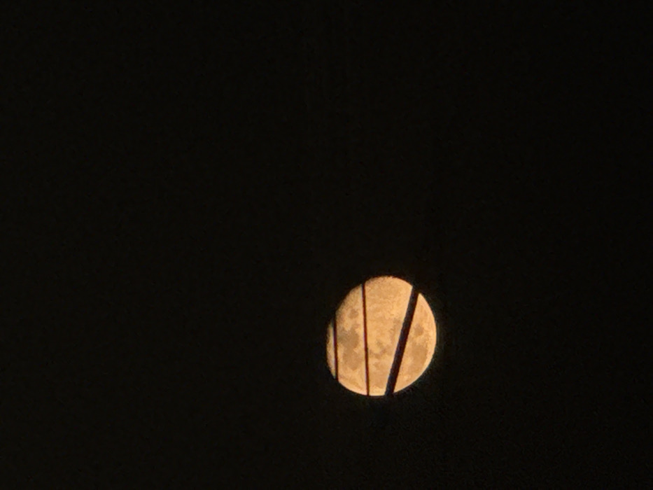 A bright, yellowish moon hangs in a dark night sky. Several dark, diagonal lines obscure portions of the moon's surface, resembling thin structures like wires or branches. The moon has visible surface details. The background is a uniform, deep black.