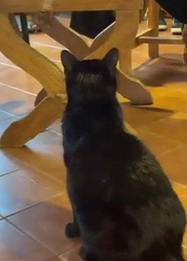 A seated black cat in a room with brown tile flooring watches a person hold a white object that dangles from a piece of string under a wooden table. The cat sits with its back facing the camera, its ears perked up and head turned to follow the movement of the white object. Other people and chair legs are visible in the background.