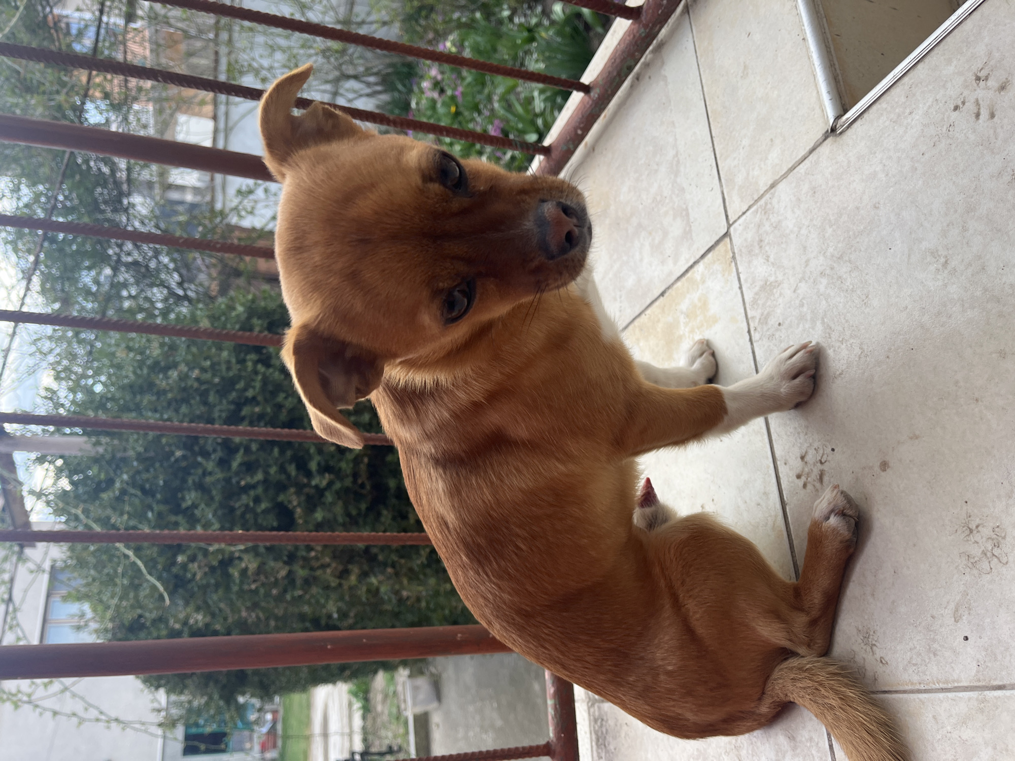 A small, short-haired male dog with tan-brown fur is seated on a light-colored tiled balcony floor in Ravno Pole, Bulgaria