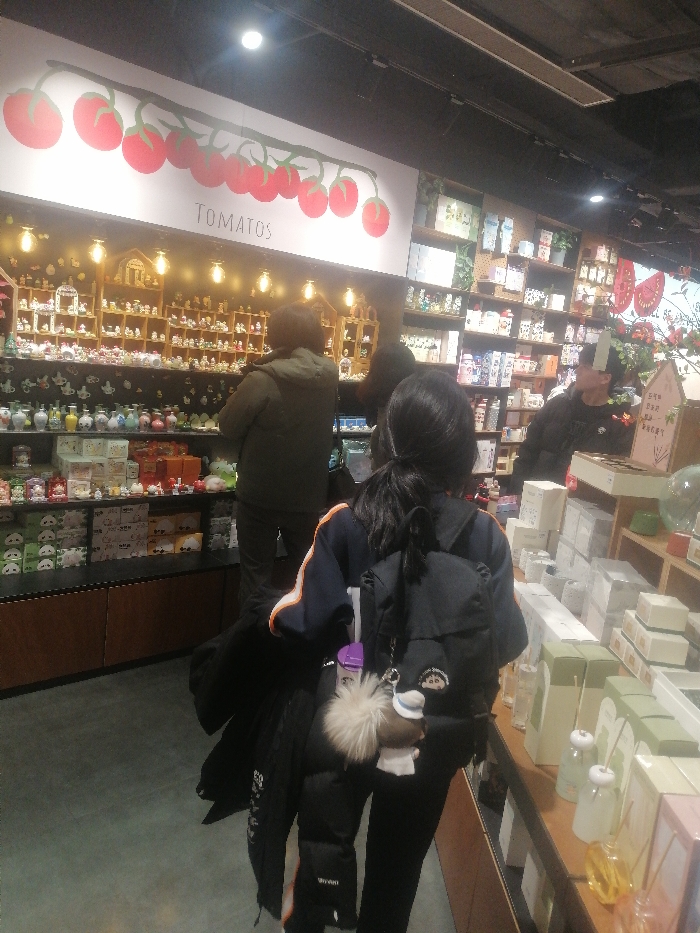 This image depicts an indoor retail environment within Dongcheng District, China. Three individuals are present, all with their backs largely or completely turned to the viewer, indicating they are browsing merchandise. In the immediate foreground, a person wears a dark jacket with orange and white stripes on the sleeves, dark pants, and a black backpack. A purple water bottle is clipped to the backpack's left strap, and a fluffy, light-colored keycharm with a small doll is attached to the right strap. A dark puffer jacket is draped over their left arm. To the left and slightly behind the foreground individual, another person stands, clad in a dark green or olive puffer jacket and dark pants, appearing to examine items on a lower display shelf. Further right and partially obscured, a third individual in dark clothing is visible. The retail space features extensive shelving units displaying a variety of products. Dominating the upper left background is a large white sign with a horizontal vine of red tomato illustrations and the word "TOMATOES" in dark capital letters. Below this sign, numerous tiered shelves hold a dense collection of small figurines, decorative objects, and boxed merchandise. These shelves are illuminated by a series of exposed bulb spotlights. Below these, a display section contains rows of small, colorful ceramic vases or containers. On the right side of the image, additional shelving units are packed with various packaged goods, appearing as boxed products, possibly cosmetics or home accessories. A wooden display unit in the lower right features small bottles, likely diffusers or fragrances, alongside other boxed items. The flooring appears to be a light-colored tile, and the ceiling is dark with visible track lighting fixtures. The overall lighting is a combination of bright overhead illumination and warmer spotlights directed at merchandise displays.
