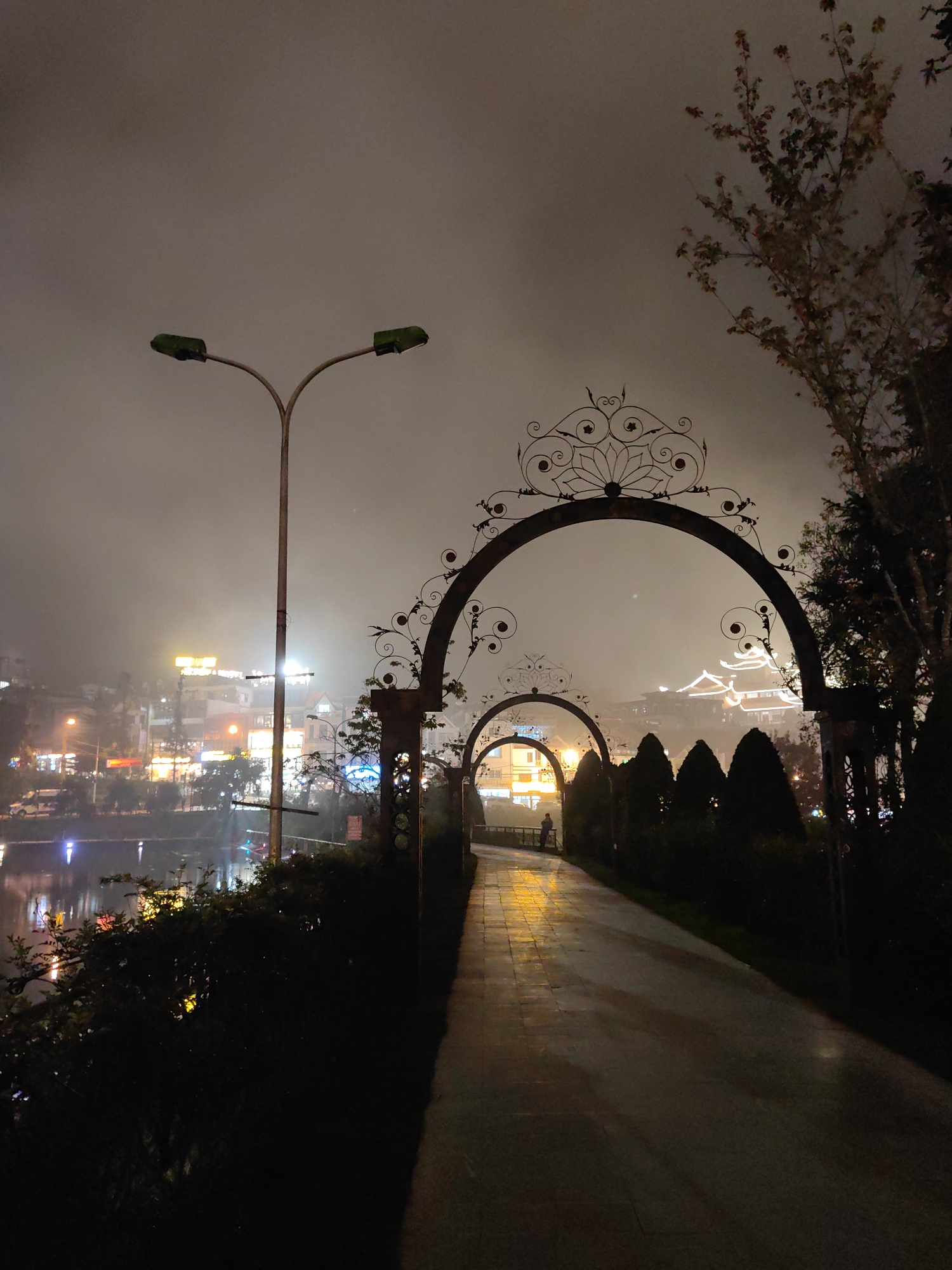 The image depicts a nighttime scene in Sa Pa, Vietnam, specifically along a pathway bordering Sa Pa Lake, in heavy mist or fog. A paved pathway, wet and reflecting artificial light, extends from the foreground into the middle distance. Overhead, a series of dark, ornate metal arches with floral and scrollwork designs frame the pathway. To the left, a tall streetlight with two green-capped luminaires illuminates the area near a dark body of water, Sa Pa Lake, which reflects numerous colorful lights from the distant shore. Across the lake, numerous multi-story buildings with various illuminated signs and windows are visible through the mist, including one prominent structure with bright yellow lettering. A single individual is discernible on the pathway in the middle distance, standing near a low barrier beside the lake, facing away from the camera. In the background, further through the arches and mist, a large building with a distinctive, illuminated multi-tiered roofline is visible. Dark shrubbery borders the pathway, and trees with sparse foliage are present on the right edge of the frame. The pervasive mist diffuses all light sources, creating a soft glow and limiting visibility.