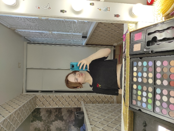 A female individual is depicted taking a mirror selfie in an indoor residential setting in the city of Марковский, Russia. The subject, appearing to be in her late teens or early twenties with light brown hair styled with face-framing strands, is wearing a black cropped t-shirt with a red rose embroidery on the left chest, revealing her midriff. She is holding a teal-colored smartphone in her right hand, pointed towards the large vanity mirror to capture her reflection. The mirror is framed on its right by a strip of illuminated round bulbs, characteristic of a makeup vanity, and adorned with small decorative stickers including a white goose with hearts and small animal figures. In the foreground, on a vanity surface, an open, gold-cased makeup palette is prominently displayed. It contains multiple trays of eyeshadows in various colors, alongside sections holding blush/powder pans and makeup applicators. A yellow-bristled brush is visible to the right of the palette. The mirror's reflection reveals a background consisting of a white two-panel sliding wardrobe directly behind the subject's head, a window with white horizontal blinds on the right, and a wall on the left with dark floral wallpaper surmounted by beige textured tiles. A black bag and a blue fabric item rest on a counter beneath the tiled wall. The lower part of the reflection shows a floor, possibly wooden or laminate, with some partially visible text.