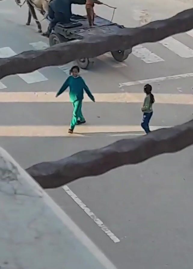 street scene, likely filmed from a window or elevated position behind a metal grate. A horse-drawn cart with a man and a child aboard is seen moving across a pedestrian crosswalk. Three young children are also walking across the street, seemingly independent of the cart. The street is paved and marked with white crosswalk stripes. The overall lighting suggests daylight.