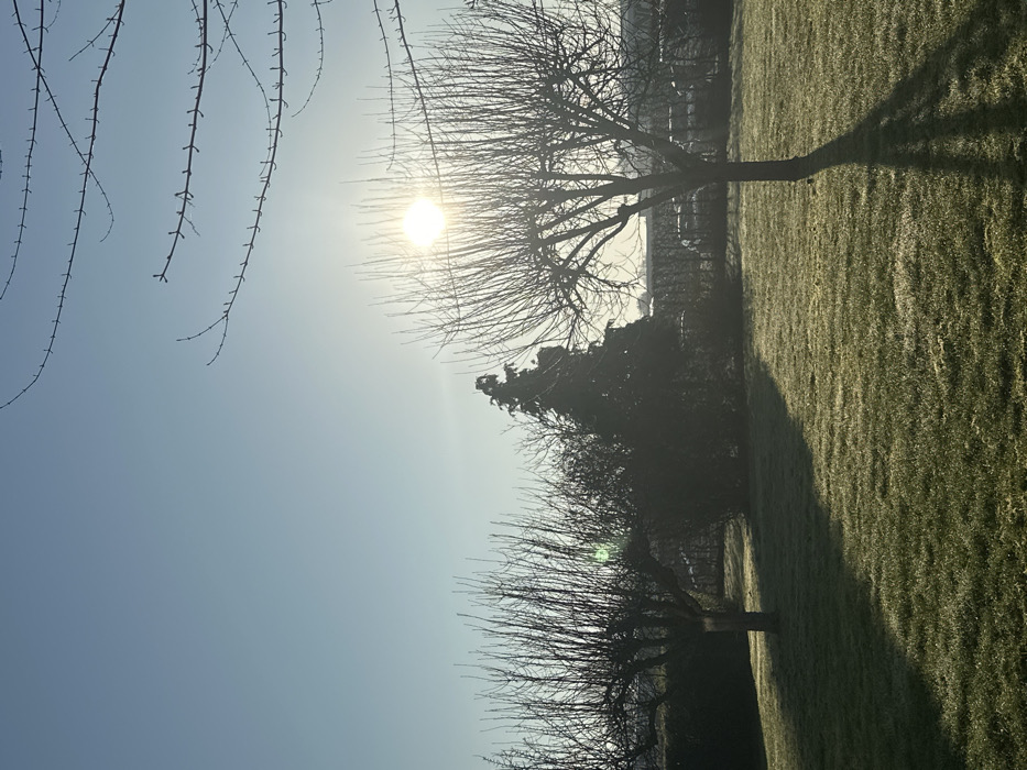 This image displays an outdoor environment in Carvin, France, under a clear, bright blue sky. The sun, appearing as a brilliant white light with radiating flares, is positioned in the upper right portion of the frame, partially obscured by the bare branches of a deciduous tree. A second bare deciduous tree, devoid of foliage, stands in the mid-left. Between these two trees, a dark, conical evergreen tree is situated further back. A line of dense, dark-green shrubs or hedges extends across the midground. The foreground is composed of green grass, exhibiting a frosted or dewy appearance that reflects the sunlight. Long, distinct shadows from the trees are cast diagonally across the grass towards the lower left. In the far background, behind a discernible fence, several indistinct light-colored structures or vehicles are visible. No individuals or active interactions are present in the scene.