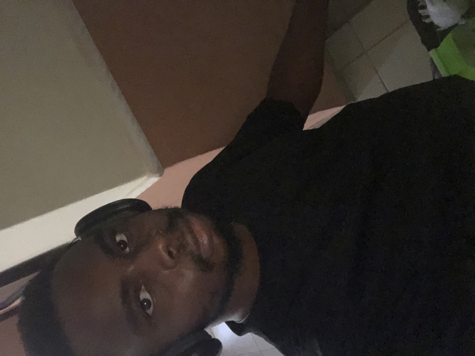 A portrait-oriented image depicts a dark-skinned male subject, centered and looking directly into the camera. He wears black over-ear headphones and a dark, short-sleeved t-shirt. The subject has short dark hair and a trimmed beard/stubble. The background reveals an indoor setting: a light-colored ceiling with a molding strip transitions to a reddish-brown painted wall on the right. In the bottom right corner, a cream-colored tiled floor is partially visible, along with a portion of a bright green plastic object and a white, fluffy material. Lighting is moderate. No discernible features within the image indicate a specific location in Karu, Nigeria.