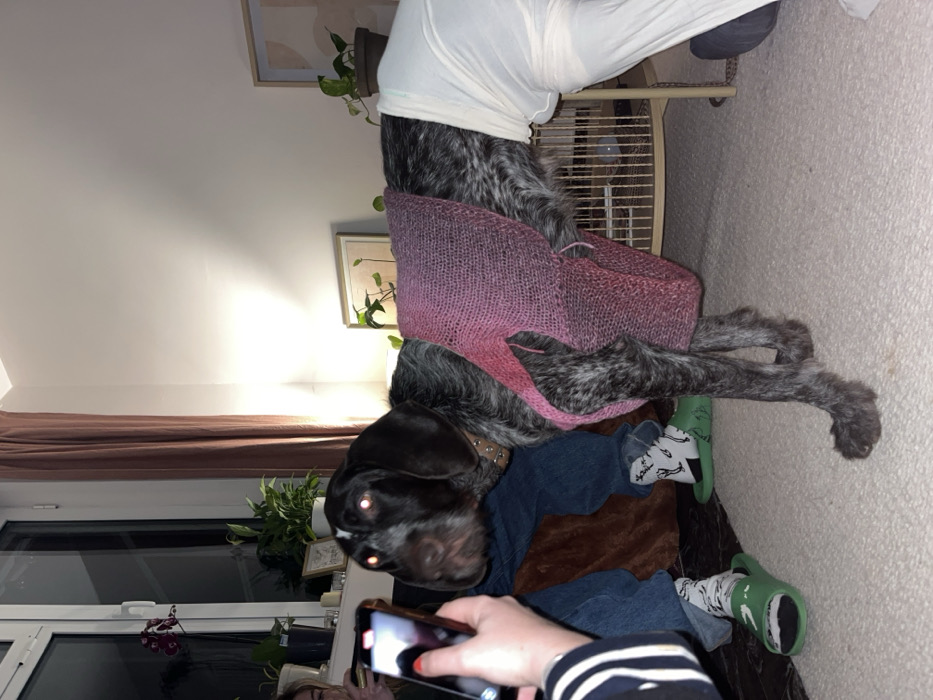 - "A person in a white shirt stands behind a dog wearing a pink knitted poncho" by FM-6gMpy2, licensed under CC BY 4.0