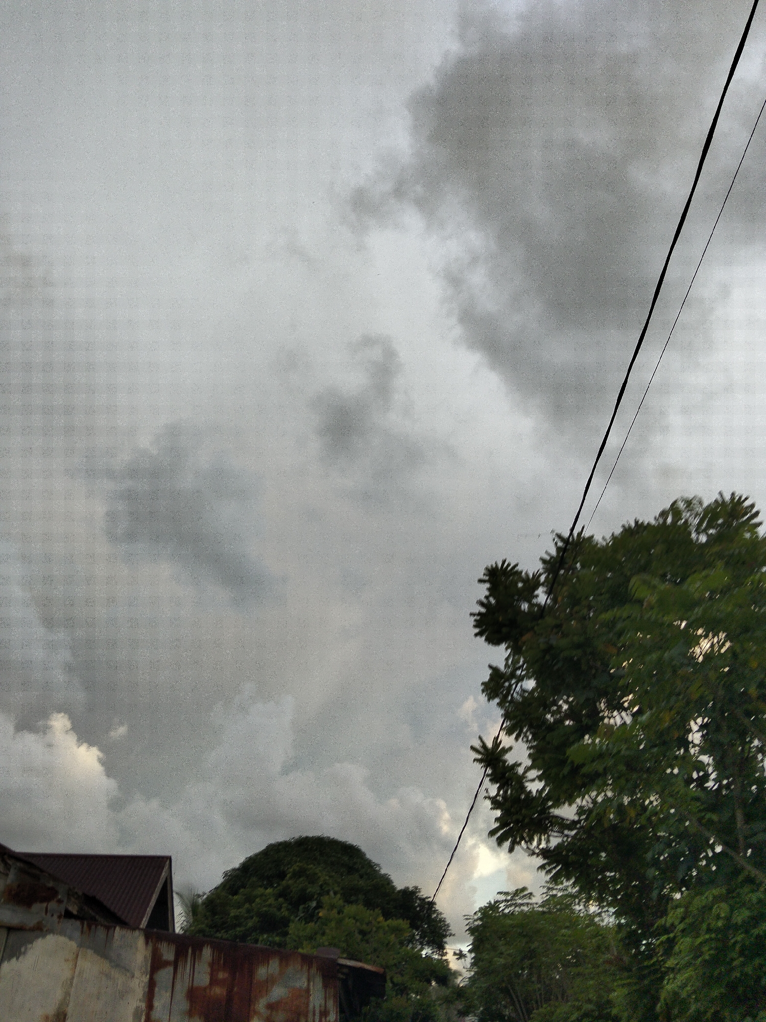 cloudy sky with a few trees and a building in the foreground. Two power lines are visible. The building has a red roof and a rusty corrugated metal wall. The trees are green and lush. The sky is gray and overcast. The location appears to be in a residential area. The city and state are unknown.