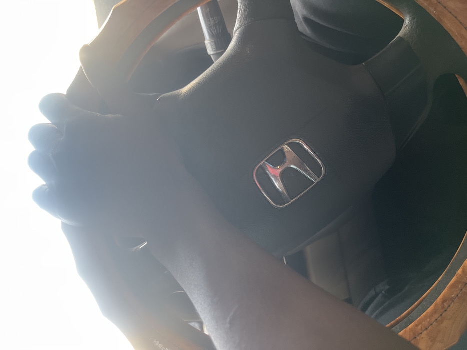 The image depicts the interior of a vehicle, focusing on the steering wheel and the hands of a driver. Two dark-skinned hands are clasped over the upper portion of a black steering wheel, which features a silver Honda logo prominently in its center. The steering wheel has a light-colored, possibly wooden, rim. A control stalk is partially visible to the right of the steering wheel. Dark fabric, likely part of the driver's clothing, is visible below the steering wheel. The scene is brightly lit from outside the vehicle, creating a significant overexposure in the upper areas and silhouetting the hands and steering wheel. The specific location within Jos, Nigeria, is not discernible from the image.