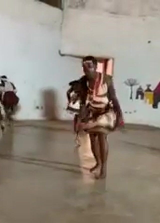 A group of individuals is performing a traditional dance in a large, open room. The dancers are dressed in matching tribal attire, including headbands, beaded necklaces, and short skirts with patterned designs. They are barefoot. The room has white walls, and a door is visible in the background. There's a mural painted on the wall that includes images of huts and stylized figures. The dancers move in sync, performing rhythmic steps and gestures. The camera captures their movements from a low angle, providing a clear view of the dance.