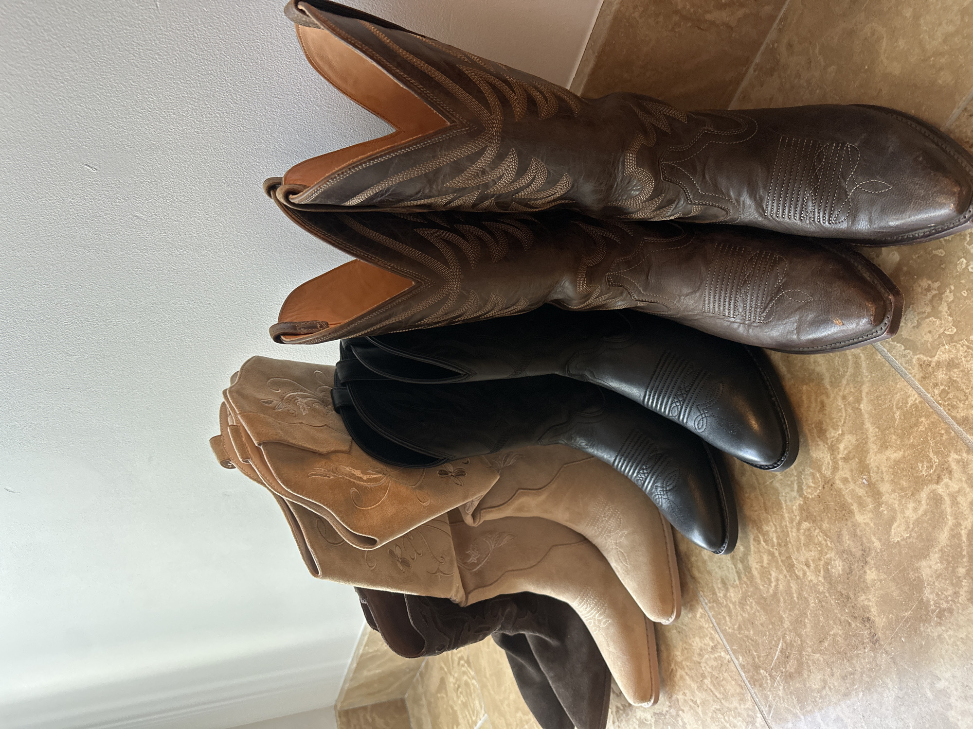 A stack of five pairs of cowboy boots sits on a reflective surface