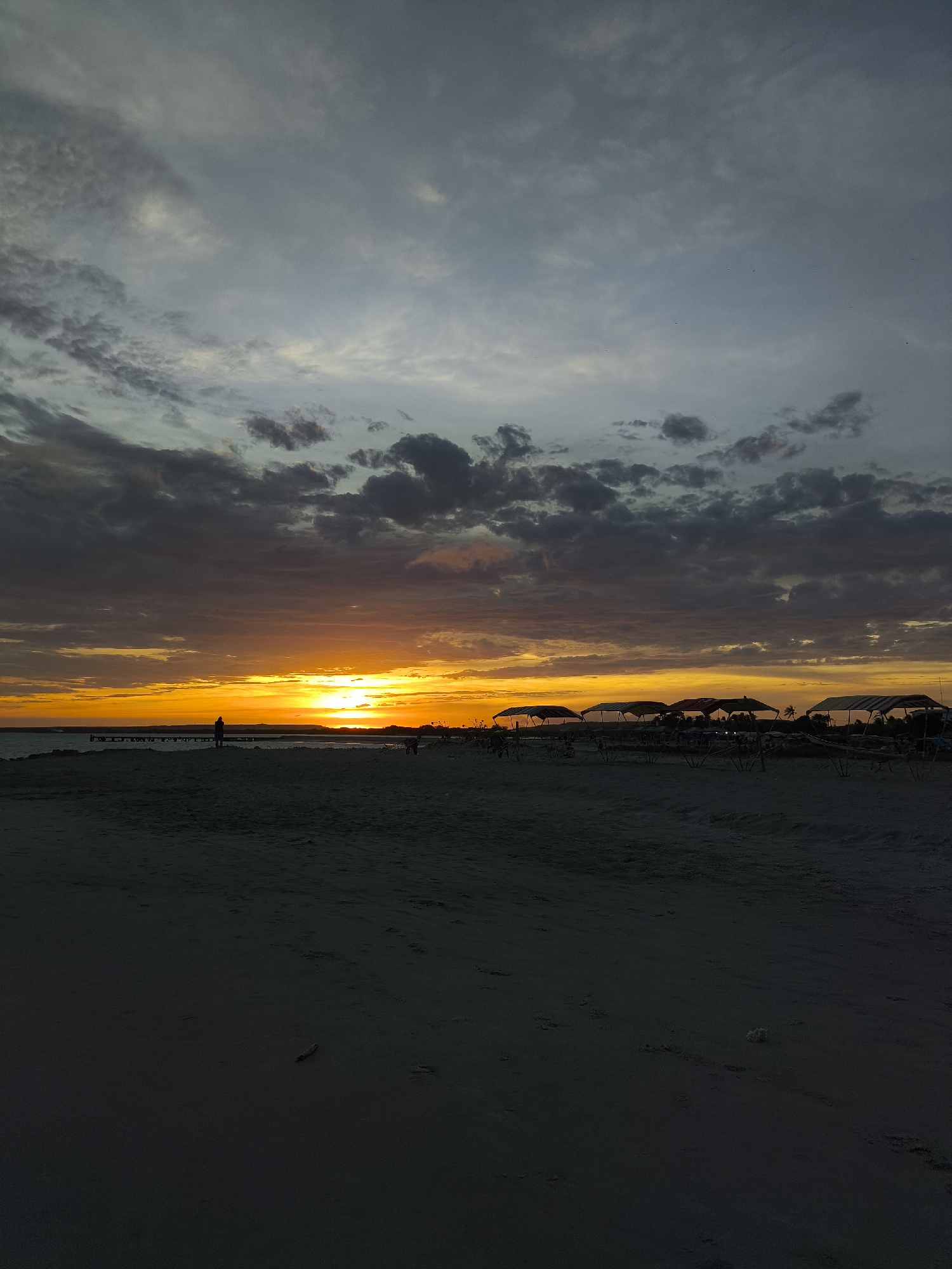 The image depicts a sunset scene at El Yaque, Venezuela. The sky is filled with layered clouds, transitioning from dark gray and blue tones above to a bright orange and yellow horizon where the sun is setting. The beach is in the foreground, appearing dark and indistinct. Several silhouetted figures are visible on the beach, along with beach umbrellas or canopies. There is a pier or structure extending into the water on the left side of the image. The overall impression is one of dusk descending on a tropical beach.