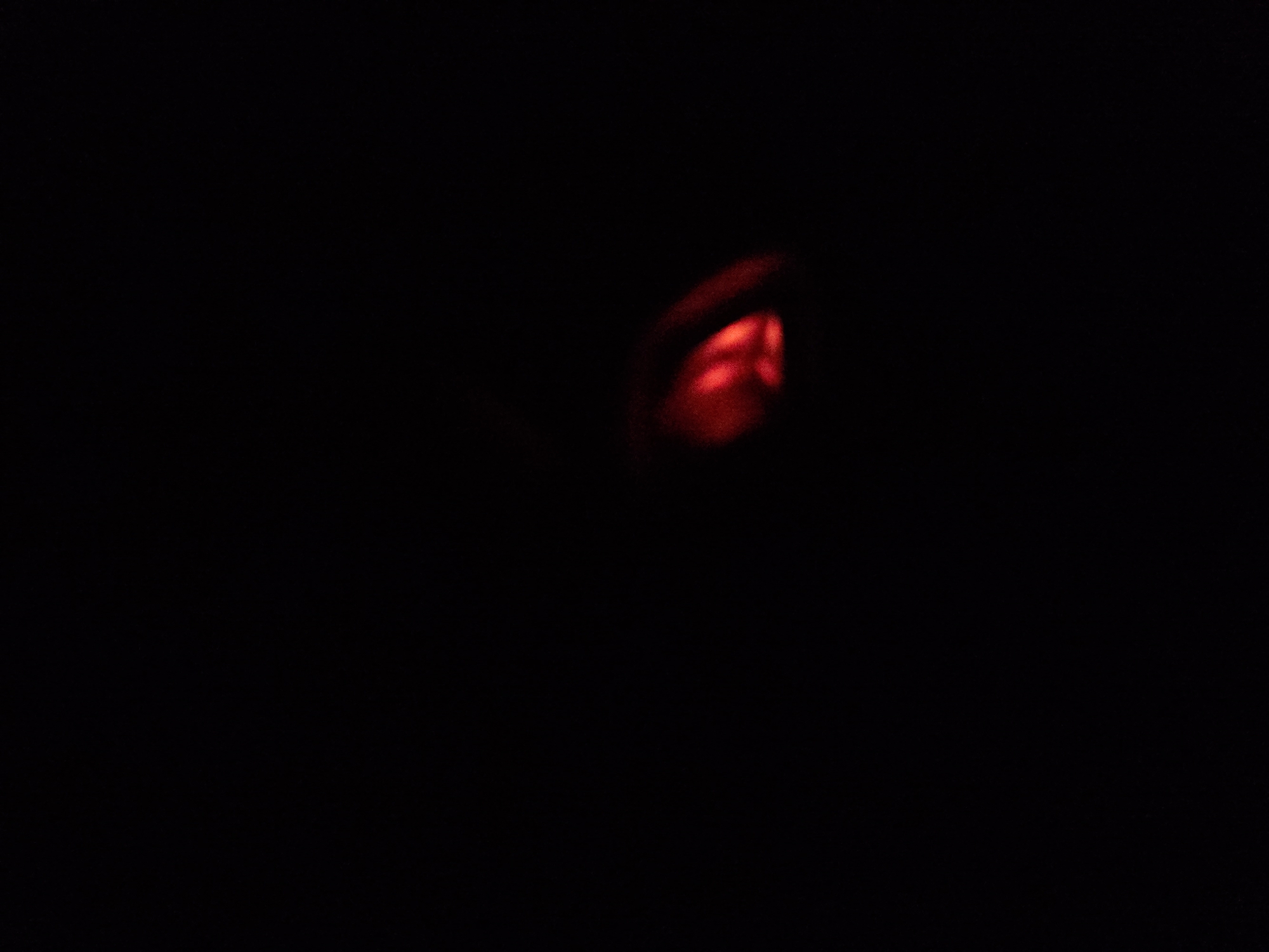 The image depicts an extremely dark environment, almost entirely black, with a single, indistinct red light source or reflection located in the lower right quadrant of the frame