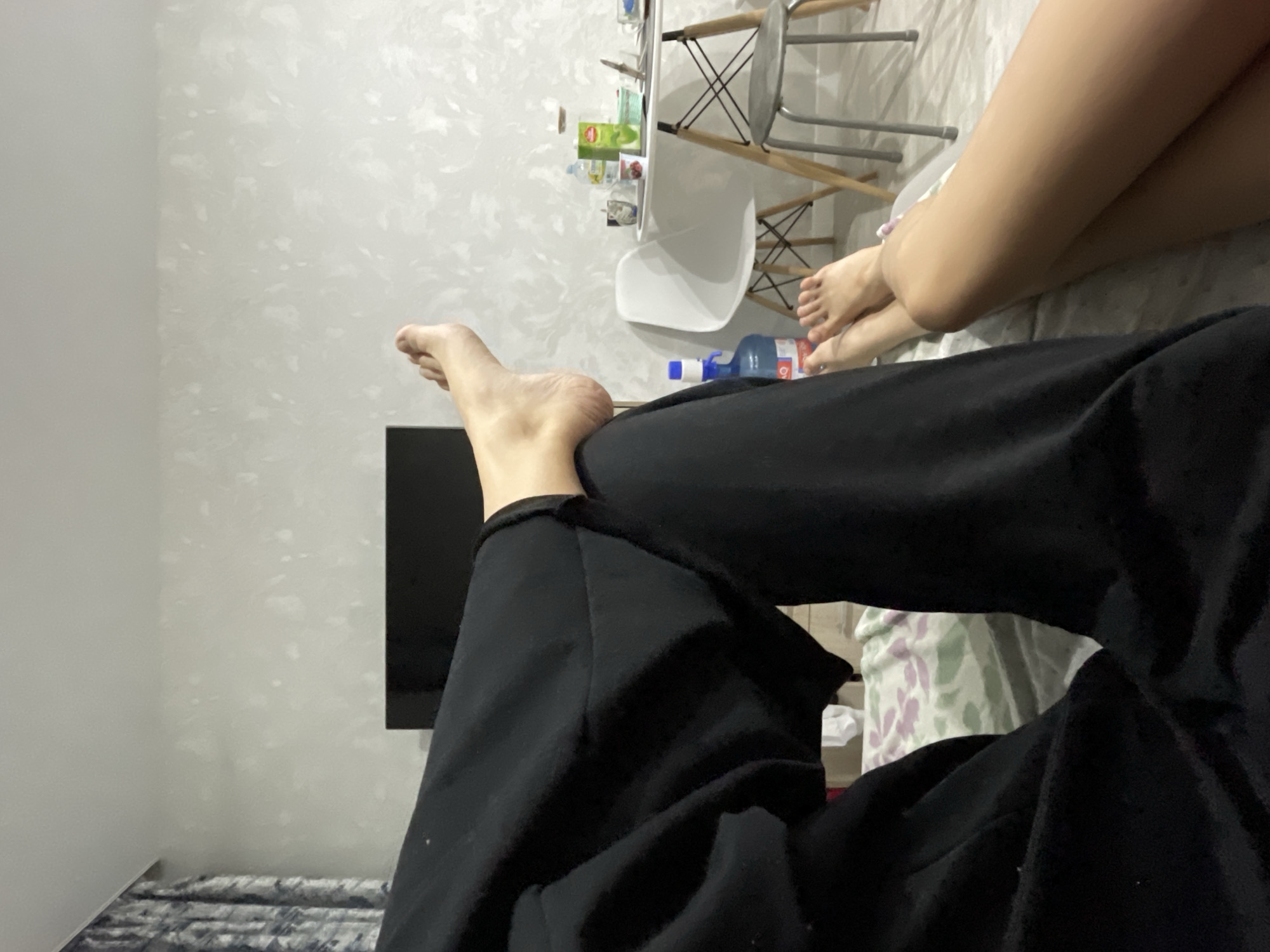 A person's legs and feet are visible in the image. The person is wearing black pants and lying on a bed. A second person's legs and feet are visible to the right of the person in black pants. There is a table and chairs in the background, along with bottles and other objects on the table. The wall is white. The location is indoors and the city is not discernible.