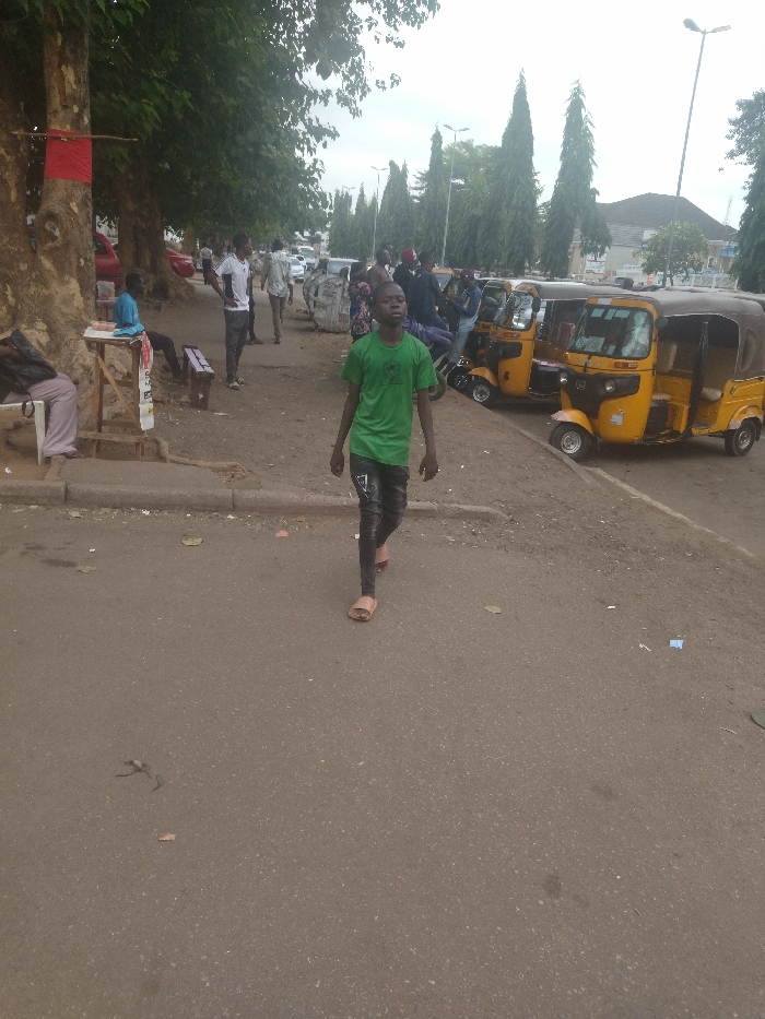 young man in a green shirt and black pants walking on a paved road in the city of Aso, Nigeria