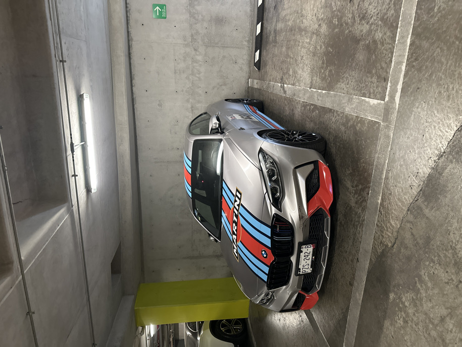A silver BMW coupe, adorned with a Martini racing stripe, is parked in a concrete parking garage. The car features a custom red and black front bumper. The parking space is narrow, with concrete walls on either side. A green emergency exit sign is visible on the back wall. A yellow structure and other parked vehicles can be seen beneath the car. The vehicle’s license plate is partially visible.